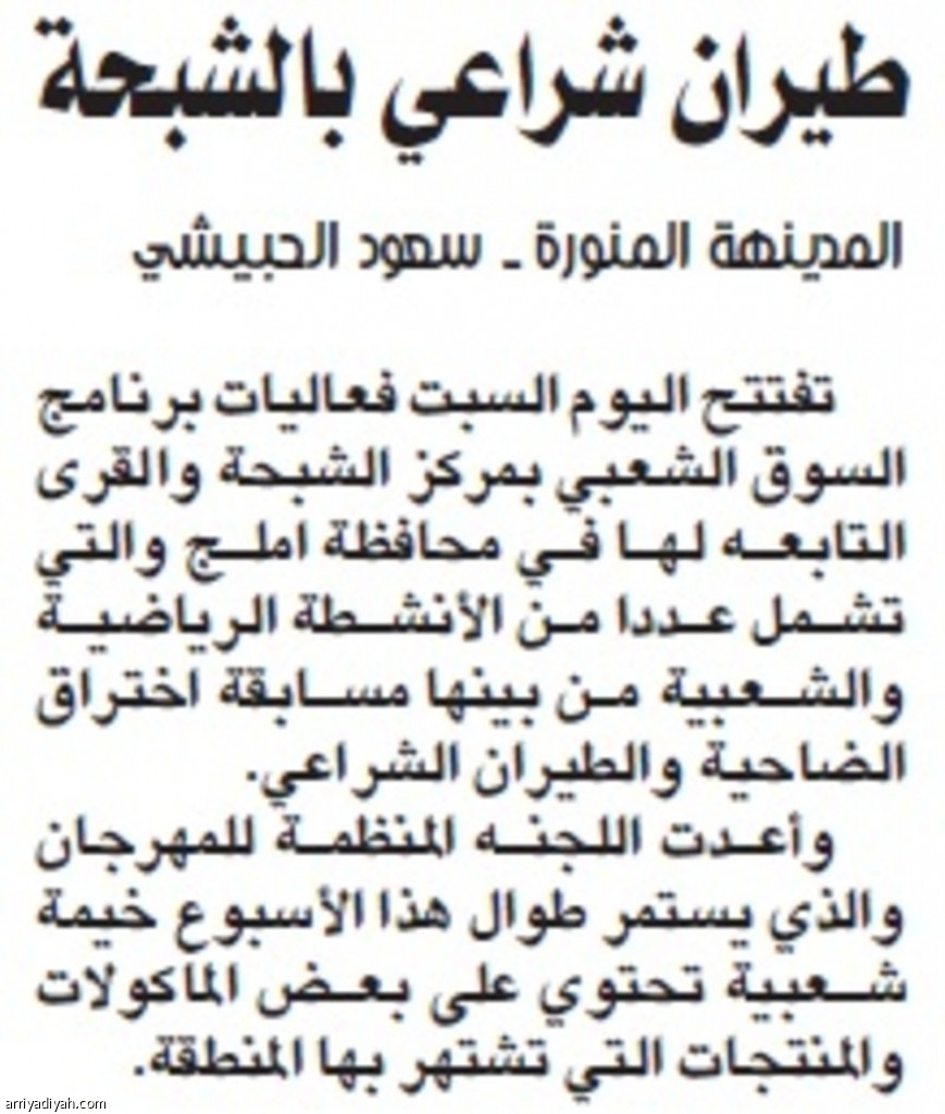 تفتتح اليوم السبت فعاليات برنامج السوق الشعبي بمركز الشبحة والقرى التابعه لها في محافظة املج والتي تشمل عددا من الأنشطة الرياضية والشعبية من بينها مسابقة اختراق الضاحية والطيران الشراعي.