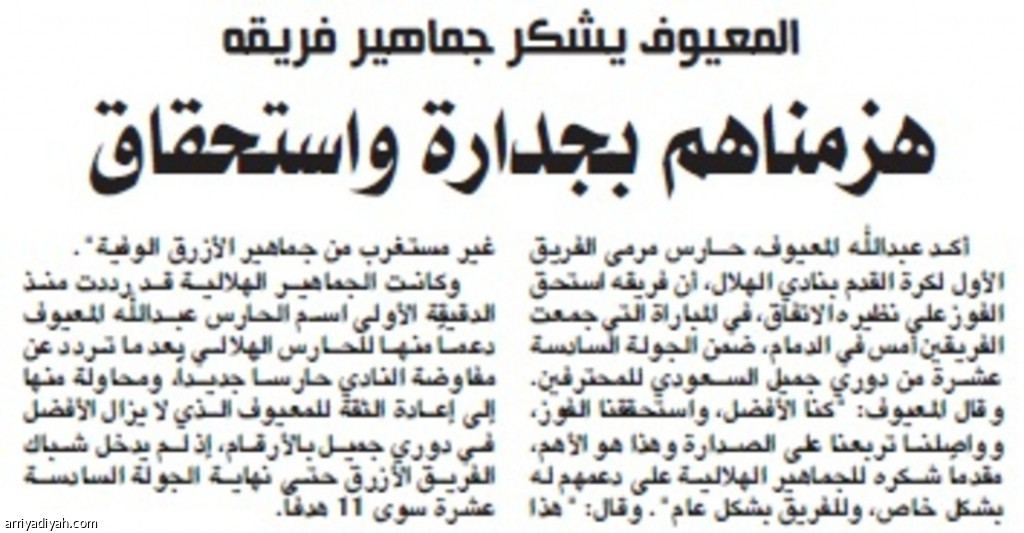 أكد عبدالله المعيوف، حارس مرمى الفريق الأول لكرة القدم بنادي الهلال، أن فريقه استحق الفوز على نظيره الاتفاق، في المباراة التي جمعت الفريقين أمس في الدمام، ضمن الجولة السادسة عشرة من دوري جميل السعودي للمحترفين. وقال المعيوف: "كنا الأفضل، واستحققنا الفوز، وواصلنا تربعنا على الصدارة وهذا هو الأهم، مقدماً شكره للجماهير الهلالية على دعمهم له بشكل خاص، وللفريق بشكل عام". وقال: "هذا غير مستغرب من جماهير الأزرق الوفية".