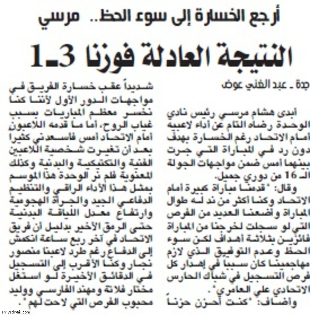 أبدى هشام مرسي رئيس نادي الوحدة رضاه التام عن أداء لاعبيه أمام الاتحاد رغم الخسارة بهدف دون رد في المباراة التي جرت بينهما أمس ضمن مواجهات الجولة الـ 16 من دوري جميل.