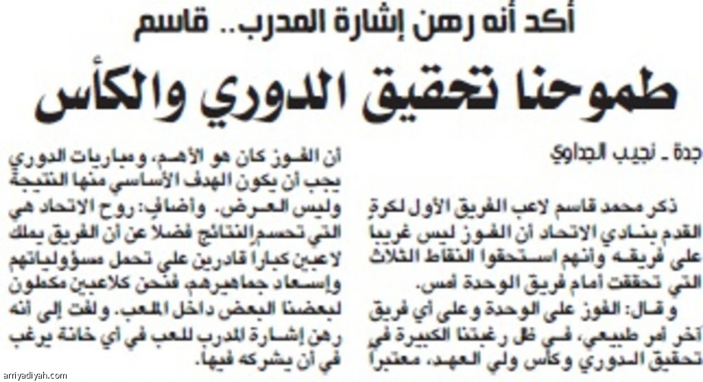 ذكر محمد قاسم لاعب الفريق الأول لكرة القدم بنادي الاتحاد أن الفوز ليس غريباً على فريقه وأنهم استحقوا النقاط الثلاث التي تحققت أمام فريق الوحدة أمس.