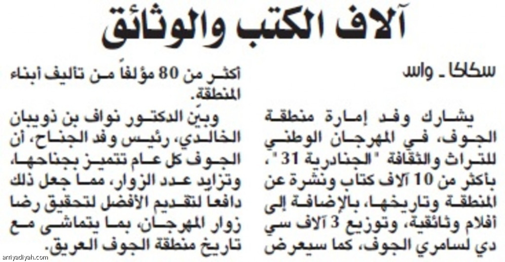 يشارك وفد إمارة منطقة الجوف، في المهرجان الوطني للتراث والثقافة "الجنادرية 31"، بأكثر من 10 آلاف كتاب ونشرة عن المنطقة وتاريخها، بالإضافة إلى أفلام وثائقية، وتوزيع 3 آلاف سي دي لسامري الجوف، كما سيعرض أكثر من 80 مؤلفاً من تأليف أبناء المنطقة.