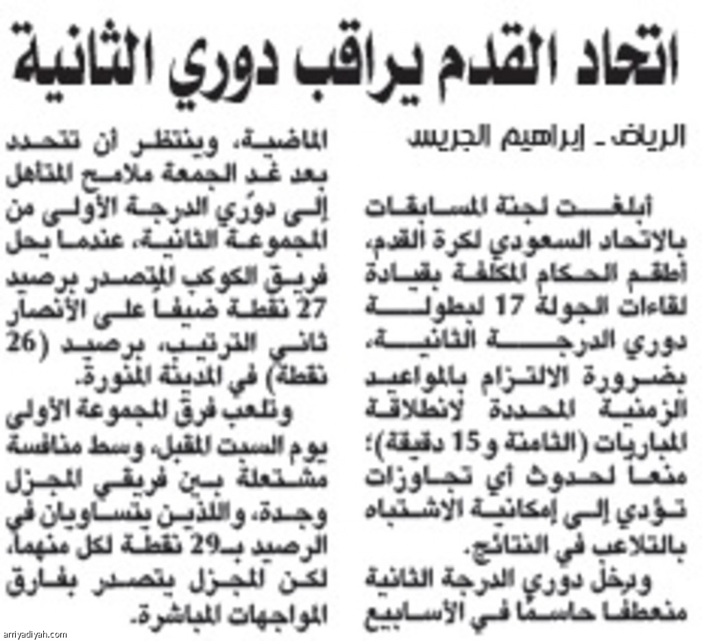 أبلغــت لجنة المسابقـات بالاتحاد السعودي لكرة القدم، أطقم الحكام المكلفة بقيادة لقاءات الجولة 17 لبطولــــة دوري الدرجـــــة الثانيـــة، بضرورة الالتزام بالمواعيد الزمنية المحددة لانطلاقة المباريات (الثامنة و15 دقيقة)؛ منعاً لحدوث أي تجاوزات تؤدي إلى إمكانية الاشتباه بالتلاعب في النتائج.