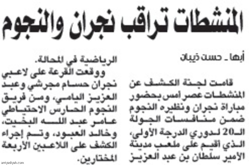 قامت لجـنة الكـشف عن المنشطـات عصر أمس بحضور مباراة نجران ونظيره النجوم ضمن مـنـافـسات الجـولة الـ20 لدوري الدرجة الأولى، الذي أقيم على ملعب مدينة الأمير سلطان بن عبد العزيـز الرياضية في المحالة.