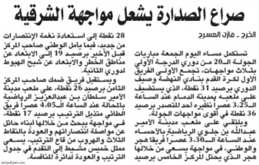 تستكمل مساء اليوم الجمعة مباريات الجولة الـ20 من دوري الدرجة الأولى بثلاث مواجهات، تجمع الأولى الفريق الأول لكرة القدم بنادي النهضة وصيف الدوري برصيد 31 نقطة، الذي يستضيف على ملعبه بمدينة الدمام عند الساعة الـ3,25 عصراً نظيره أحد المتصدر برصيد 36 نقطة في أقوى مواجهات الجولة.