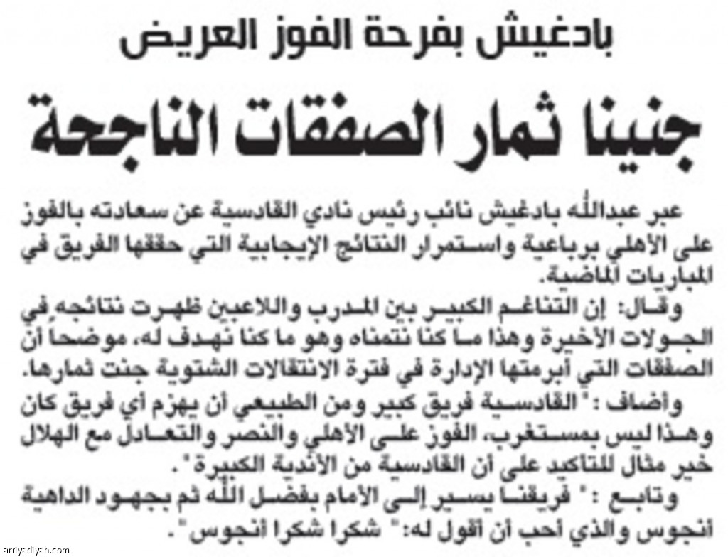 عبر عبدالله بادغيش نائب رئيس نادي القادسية عن سعادته بالفوز على الأهلي برباعية واستمرار النتائج الإيجابية التي حققها الفريق في المباريات الماضية.