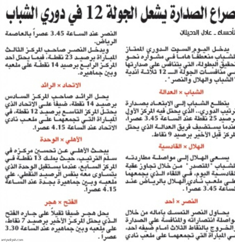 صراع الصدارة يشعل الجولة 12 في دوري الشباب