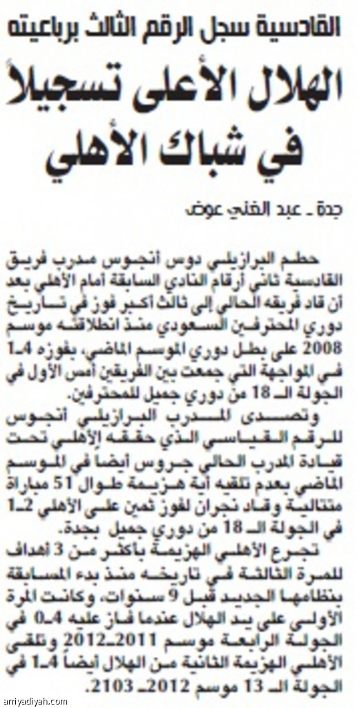 حطم البرازيلي دوس أنجوس مدرب فريق القادسية ثاني أرقام النادي السابقة أمام الأهلي بعد أن قاد فريقه الحالي إلى ثالث أكـبر فوز في تــاريـخ دوري المحترفين السعودي منذ انطلاقته موسم 2008 على بطـل دوري الموسم الماضي، بفوزه 4ـ1 في المواجهة التي جمعت بين الفريقين أمس الأول في الجولة الـ 18 من دوري جميل للمحترفين.