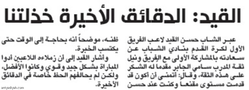 عبر الشاب حسن القيد لاعب الفريق الأول لكرة القدم بنادي الشباب عن سعادته بالمشاركة الأولى مع الفريق ونيل ثقة المدرب سامي الجابر مقدماً له الشكر على هذه الثقة، وقال: أتمنى أن أكون قد قدمت مستوى مقنعاً وكنت عند حسن ظنه، موضحاً أنه بحاجة إلى الوقت حتى يكتسب الخبرة.