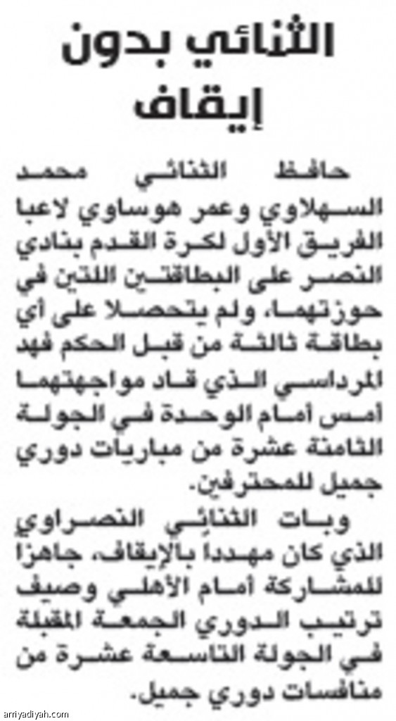 حافظ الثنائي محمد السهلاوي وعمر هوساوي لاعبا الفريق الأول لكرة القدم بنادي النصر على البطاقتين اللتين في حوزتهما، ولم يتحصلا على أي بطاقة ثالثة من قبل الحكم فهد المرداسي الذي قاد مواجهتهما أمس أمام الوحدة في الجولة الثامنة عشرة من مباريات دوري جميل للمحترفين.