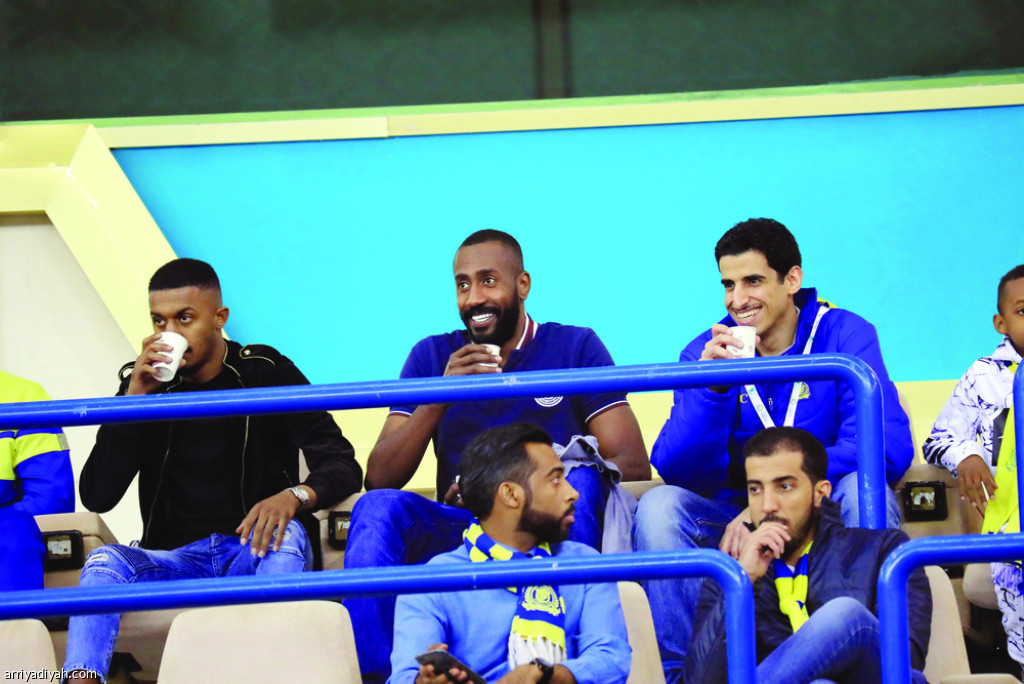 وحرص وليد على دعم زملائه اللاعبين في المدرجات بجانب أحد أبنائه، الذي توشح بالشال النصراوي.
