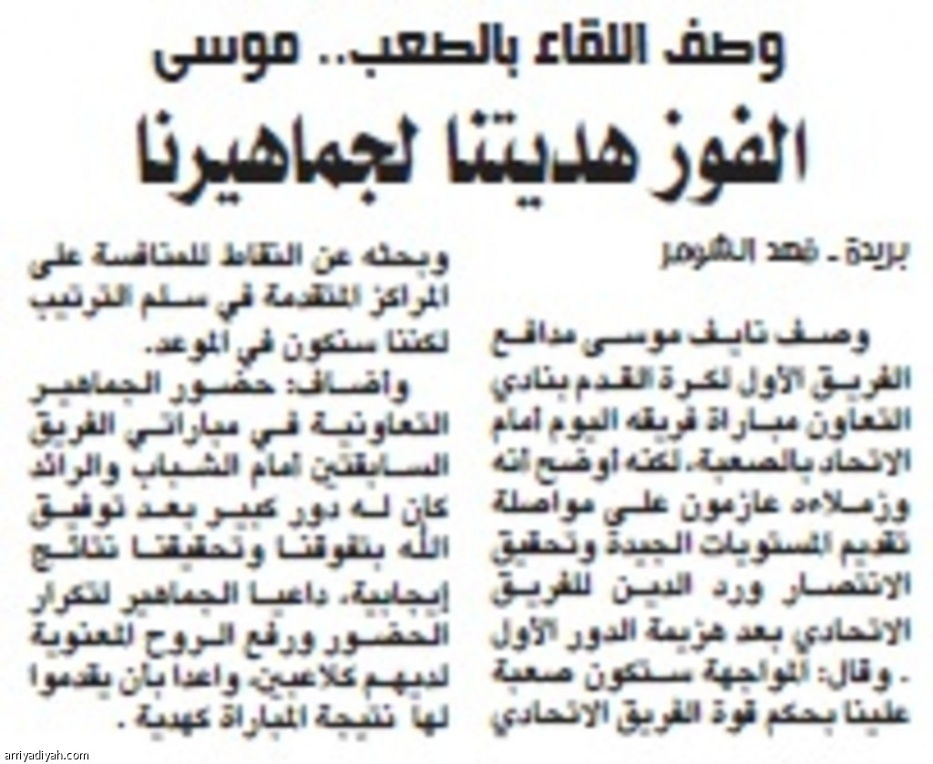 وصف نايف موسى مدافع الفريق الأول لكرة القدم بنادي التعاون مباراة فريقه اليوم أمام الاتحاد بالصعبة، لكنه أوضح أنه وزملاءه عازمون على مواصلة تقديم المستويات الجيدة وتحقيق الانتصار ورد الدين للفريق الاتحادي بعد هزيمة الدور الأول . وقال: المواجهة ستكون صعبة علينا بحكم قوة الفريق الاتحادي وبحثه عن النقاط للمنافسة على المراكز المتقدمة في سلم الترتيب لكننا سنكون في الموعد.