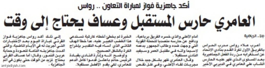 أعرب علاء رواس مدرب الحراس بالفريق الأول لكرة القدم بنادي الاتحاد عن استغرابه من ردة الفعل الجماهيرية بعد المستوى الذي ظهر عليه الحارس الشاب علي العامري في الديربي الأخير أمام الأهلي والذي خسره الفريق برباعية، ودافع عن حارسه متصديا للحملة القوية التي وجهت ضده وطالب الجمهور بدعمه لاسيما وأنه في مقتبل العمر وسيفيد النادي مستقبلا .
