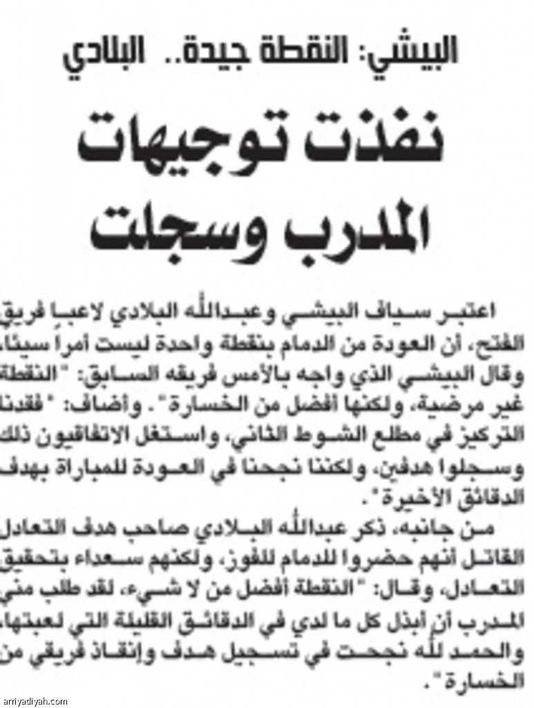 اعتبر سياف البيشي وعبدالله البلادي لاعبا فريق الفتح، أن العودة من الدمام بنقطة واحدة ليست أمراً سيئاً، وقال البيشي الذي واجه بالأمس فريقه السابق: "النقطة غير مرضية، ولكنها أفضل من الخسارة". وأضاف: "فقدنا التركيز في مطلع الشوط الثاني، واستغل الاتفاقيون ذلك وسجلوا هدفين، ولكننا نجحنا في العودة للمباراة بهدف الدقائق الأخيرة".
