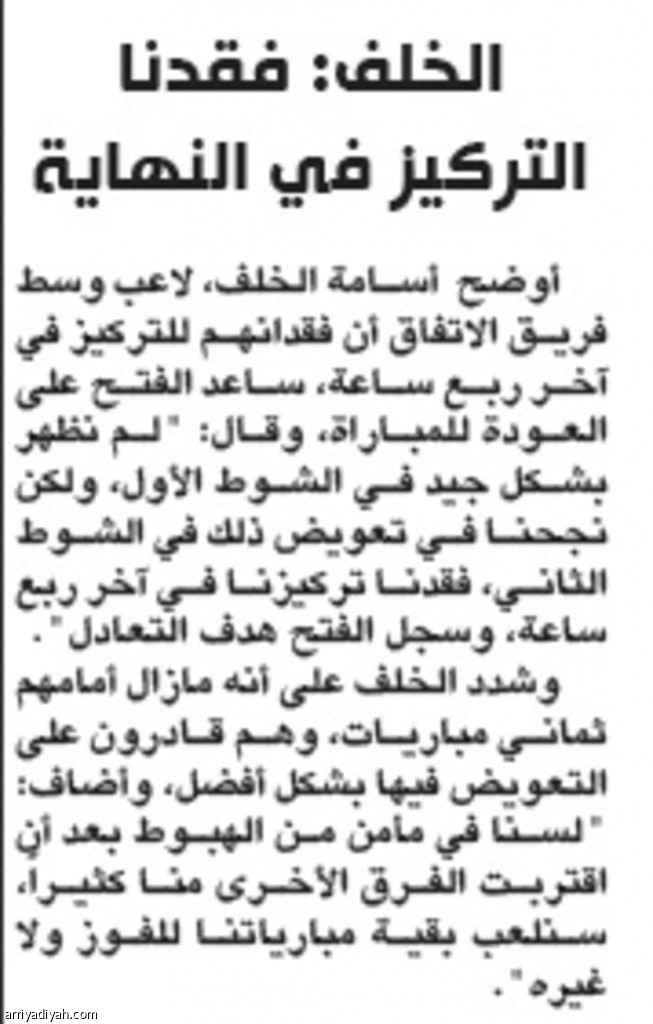 وشدد الخلف على أنه مازال أمامهم ثماني مباريات، وهم قادرون على التعويض فيها بشكل أفضل، وأضاف: "لسنا في مأمن من الهبوط بعد أن اقتربت الفرق الأخرى منا كثيراً، سنلعب بقية مبارياتنا للفوز ولا غيره".
