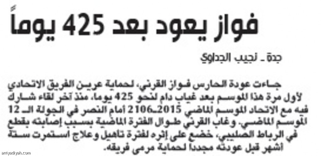 جاءت عودة الحارس فواز القرني، لحماية عرين الفريق الاتحادي لأول مرة هذا الموسم بعد غياب دام لنحو 425 يوماً، منذ آخر لقاء شارك فيه مع الاتحاد الموسم الماضي 2015ـ2106 أمام النصر في الجولة الـ 12 الموسم الماضي. وغاب القرني طوال الفترة الماضية بسبب إصابته بقطع في الرباط الصليبي، خضع على إثره لفترة تأهيل وعلاج استمرت ستة أشهر قبل عودته مجدداً لحماية مرمى فريقه.