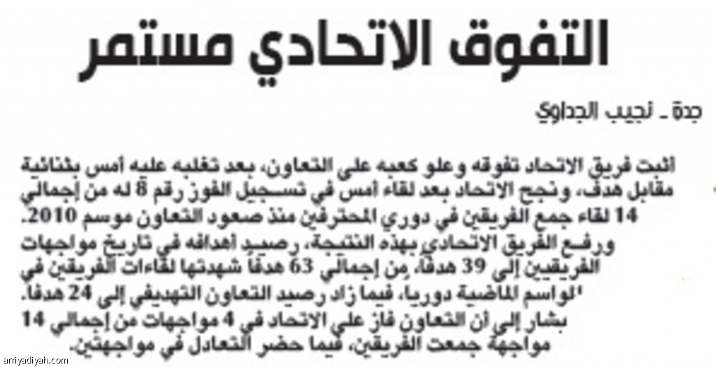 أثبت فريق الاتحاد تفوقه وعلو كعبه على التعاون، بعد تغلبه عليه أمس بثنائية مقابل هدف، ونجح الاتحاد بعد لقاء أمس في تسجيل الفوز رقم 8 له من إجمالي 14 لقاء جمع الفريقين في دوري المحترفين منذ صعود التعاون موسم 2010. ورفع الفريق الاتحادي بهذه النتيجة، رصيد أهدافه في تاريخ مواجهات الفريقيين إلى 39 هدفاً، من إجمالي 63 هدفاً شهدتها لقاءات الفريقين في المواسم الماضية دورياً، فيما زاد رصيد التعاون التهديفي إلى 24 هدفاً. يشار إلى أن التعاون فاز على الاتحاد في 4 مواجهات من إجمالي 14 مواجهة جمعت الفريقين، فيما حضر التعادل في مواجهتين.