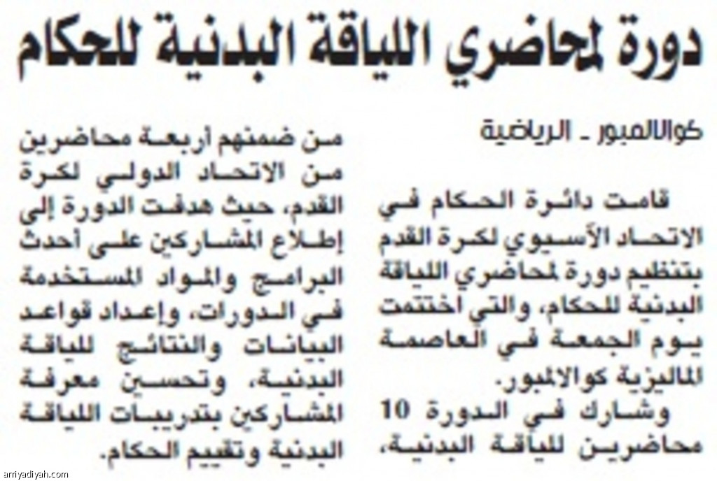 قامت دائرة الحكام في الاتحاد الآسيوي لكرة القدم بتنظيم دورة لمحاضري اللياقة البدنية للحكام، والتي اختتمت يوم الجمعة في العاصمة الماليزية كوالالمبور.
