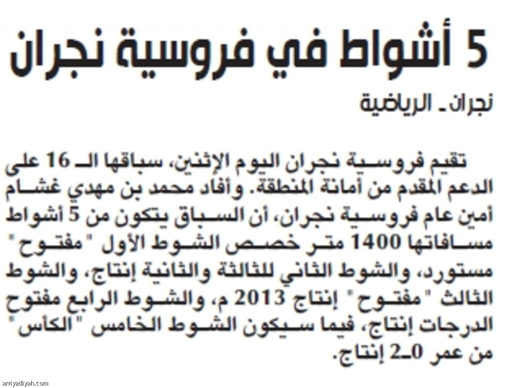 تقيم فروسية نجران اليوم الإثنين، سباقها الـ 16 على الدعم المقدم من أمانة المنطقة. وأفاد محمد بن مهدي غشام أمين عام فروسية نجران، أن السباق يتكون من 5 أشواط مسافاتها 1400 متر خصص الشوط الأول "مفتوح" مستورد، والشوط الثاني للثالثة والثانية إنتاج، والشوط الثالث "مفتوح" إنتاج 2013 م، والشوط الرابع مفتوح الدرجات إنتاج، فيما سيكون الشوط الخامس "الكأس" من عمر 0ـ2 إنتاج.