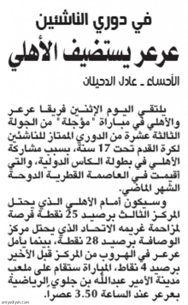 يلتقي اليوم الإثنين فريقا عرعر والأهلي في مباراة "مؤجلة" من الجولة الثالثة عشرة من الدوري الممتاز للناشئين لكرة القدم تحت 17 سنة، بسبب مشاركة الأهلي في بطولة الكأس الدولية، والتي أقيمت في العاصمة القطرية الدوحة الشهر الماضي.