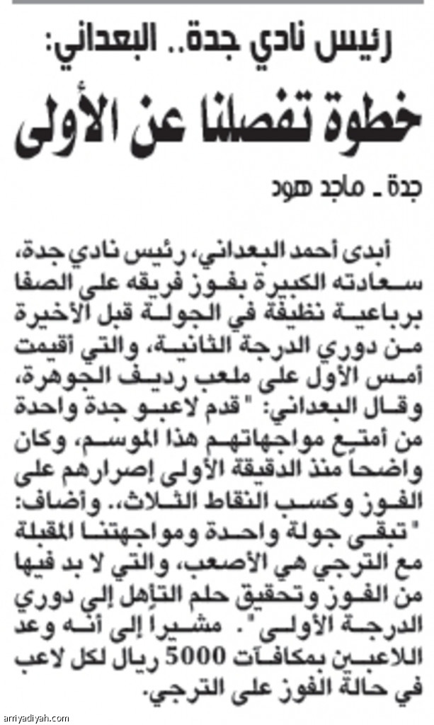أبدى أحمد البعداني، رئيس نادي جدة، سعادته الكبيرة بفوز فريقه على الصفا برباعية نظيفة في الجولة قبل الأخيرة من دوري الدرجة الثانية، والتي أقيمت أمس الأول على ملعب رديف الجوهرة، وقال البعداني: "قدم لاعبو جدة واحدة من أمتع مواجهاتهم هذا الموسم، وكان واضحاً منذ الدقيقة الأولى إصرارهم على الفوز وكسب النقاط الثلاث،. وأضاف: "تبقى جولة واحدة ومواجهتنا المقبلة مع الترجي هي الأصعب، والتي لا بد فيها من الفوز وتحقيق حلم التأهل إلى دوري الدرجة الأولى". مشيراً إلى أنه وعد اللاعبين بمكافآت 5000 ريال لكل لاعب في حالة الفوز على الترجي.