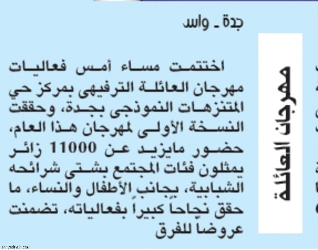 اختتمت مساء أمس فعاليات مهرجان العائلة الترفيهى بمركز حي المتنزهات النموذجى بجدة، وحققت النسخة الأولى لمهرجان هذا العام، حضور مايزيد عن 11000 زائر يمثلون فئات المجتمع بشتى شرائحه الشبابية، بجانب الأطفال والنساء، ما حقق نجاحاً كبيراً بفعالياته، تضمنت عروضاً للفرق