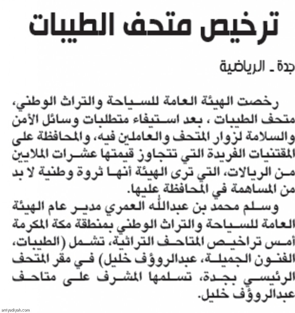 وسلم محمد بن عبدالله العمري مدير عام الهيئة العامة للسياحة والتراث الوطني بمنطقة مكة المكرمة أمس تراخيص المتاحف التراثية، تشمل (الطيبات، الفنون الجميلة، عبدالروؤف خليل) في مقر المتحف الرئيسي بجدة، تسلمها المشرف على متاحف عبدالروؤف خليل.