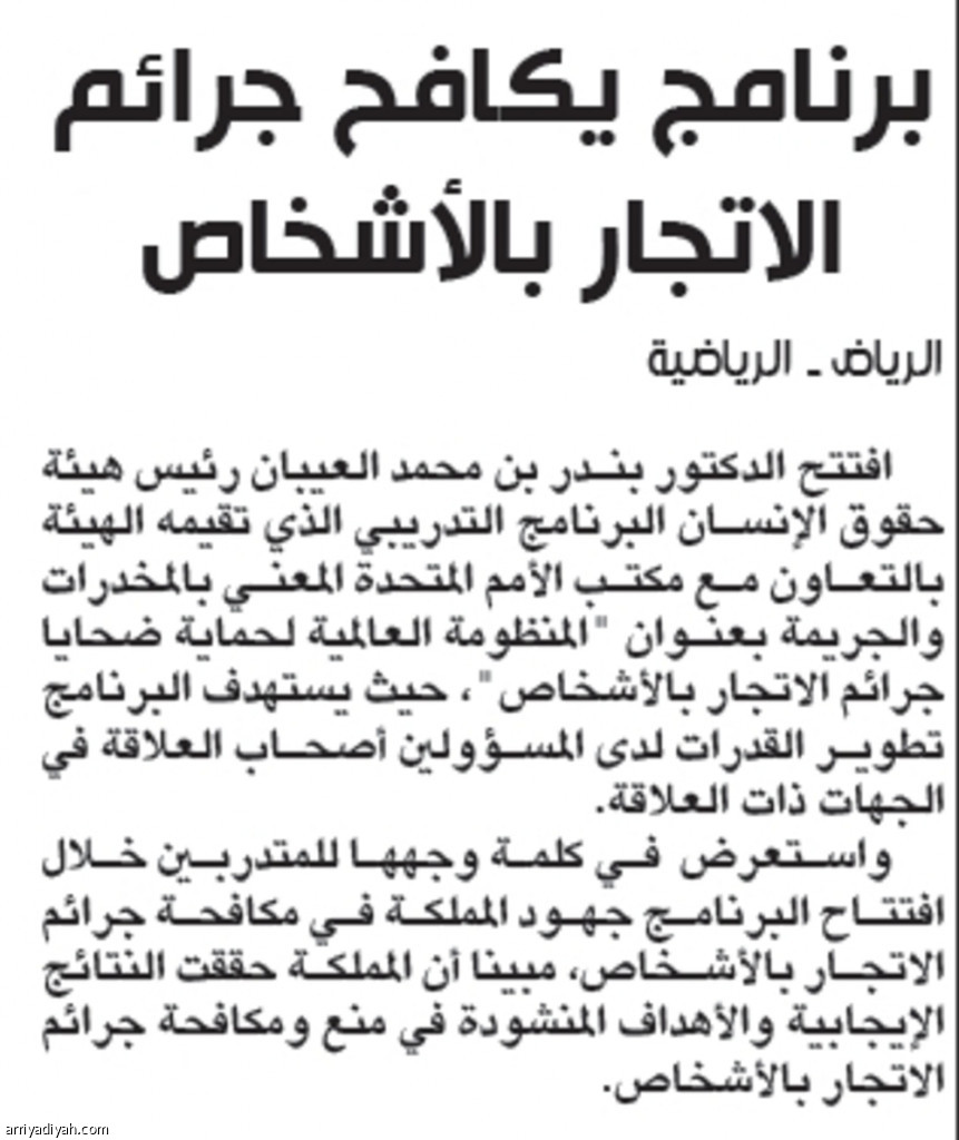 افتتح الدكتور بندر بن محمد العيبان رئيس هيئة حقوق الإنسان البرنامج التدريبي الذي تقيمه الهيئة بالتعاون مع مكتب الأمم المتحدة المعني بالمخدرات والجريمة بعنوان "المنظومة العالمية لحماية ضحايا جرائم الاتجار بالأشخاص"، حيث يستهدف البرنامج تطوير القدرات لدى المسؤولين أصحاب العلاقة في الجهات ذات العلاقة.