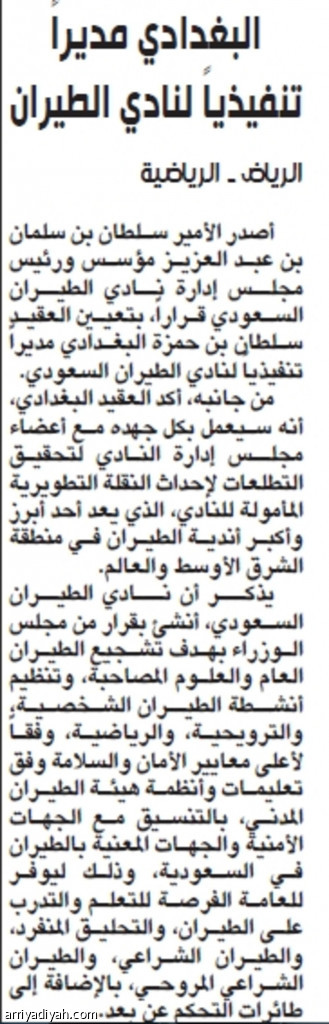 أصدر الأمير سلطان بن سلمان بن عبد العزيز مؤسس ورئيس مجلـس إدارة نـادي الطيـران السعودي قراراً، بتعيين العقيد سلطان بن حمزة البغدادي مديراً تنفيذياً لنادي الطيران السعودي.