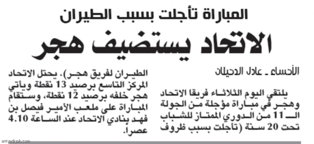 يلتقي اليوم الثلاثاء فريقا الاتحاد وهجر في مباراة مؤجلة من الجولة الـ 11 من الدوري الممتاز للشباب تحت 20 سنة (تأجلت بسبب ظروف الطيران لفريق هجر). يحتل الاتحاد المركز التاسع برصيد 13 نقطة ويأتي هجر خلفه برصيد 12 نقطة، وستقام المباراة على ملعب الأمير فيصل بن فهد بنادي الاتحاد عند الساعة 4.10 عصراً.