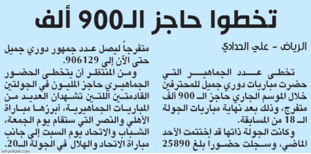 تخطى عــدد الجماهيــر التي حضرت مباريات دوري جميل للمحترفين خلال الموسم الجاري حاجز الـ 900 ألف متفرج، وذلك بعد نهاية مباريات الجولة الـ 18 من المسابقة.