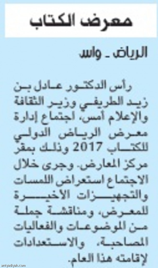 رأس الدكتور عادل بن زيد الطريفي وزير الثقافة والإعلام أمس، اجتماع إدارة معرض الرياض الدولي للكتـاب 2017 وذلك بمقر مركز المعارض. وجرى خلال الاجتماع استعراض اللمسات والتجهيــزات الأخيـــرة للمعرض، ومناقشة جملة من الموضوعات والفعاليات المصاحبة، والاستعدادات لإقامته هذا العام.