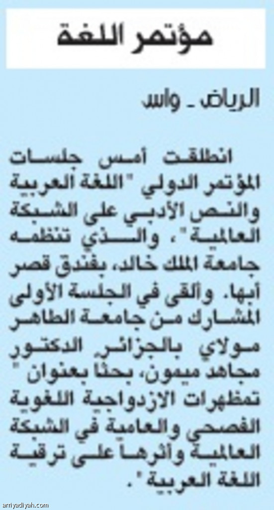 انطلقت أمس جلسات المؤتمر الدولي "اللغة العربية والنص الأدبي على الشبكة العالمية"، والــذي تنظمه جامعة الملك خالد، بفندق قصر أبها. وألقى في الجلسة الأولى المشارك من جامعة الطاهر مولاي بالجزائر الدكتور مجاهد ميمون، بحثاً بعنوان " تمظهرات الازدواجية اللغوية الفصحى والعامية في الشبكة العالمية وأثرها على ترقية اللغة العربية".