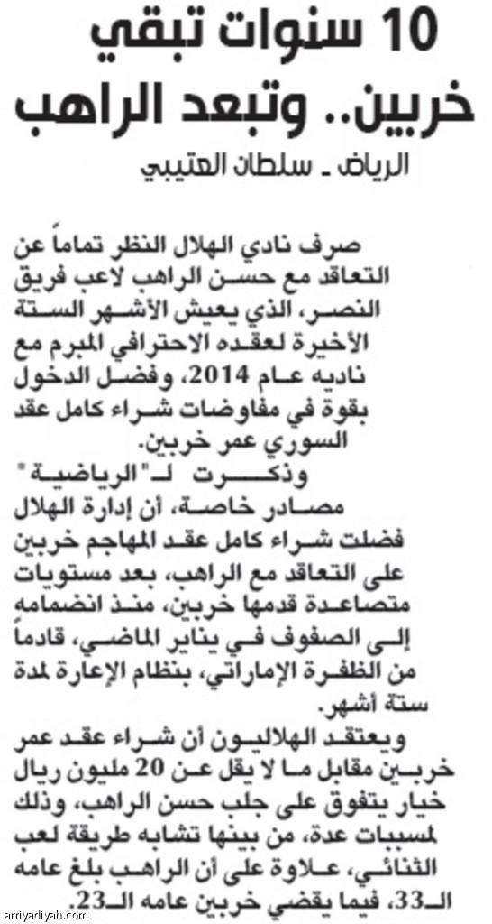 صرف نادي الهلال النظر تماماً عن التعاقد مع حسن الراهب لاعب فريق النصر، الذي يعيش الأشهر الستة الأخيرة لعقده الاحترافي المبرم مع ناديه عام 2014، وفضل الدخول بقوة في مفاوضات شراء كامل عقد السوري عمر خربين.