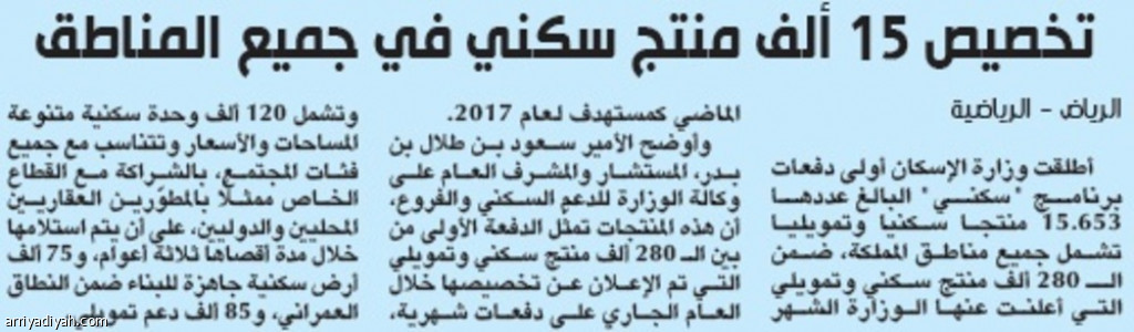 أطلقت وزارة الإسكان أولى دفعات برنامــج "سكنــي" البالغ عددهــا 15.653 منتجا سكنيا وتمويليا تشمل جميع مناطق المملكة، ضـمن الـ 280 ألف منتج سكني وتمويلي التي أعلنت عنها الوزارة الشهر الماضي كمستهدف لعام 2017.