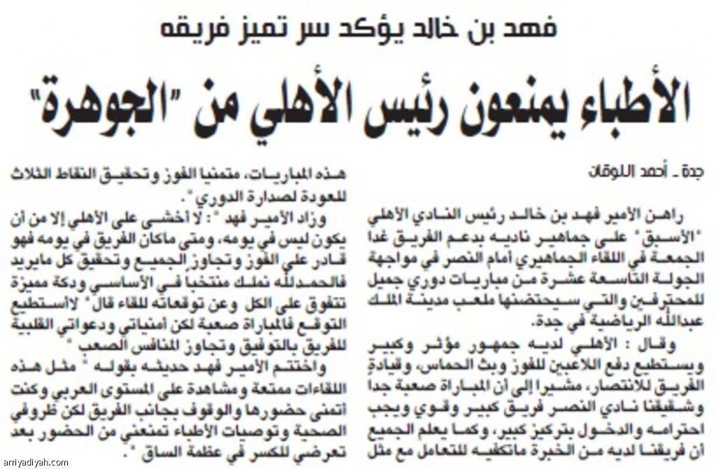 راهن الأمير فهد بن خالد رئيس النادي الأهلي "الأسبق" على جماهير ناديه بدعم الفريق غدا الجمعة في اللقاء الجماهيري أمام النصر في مواجهة الجولة التاسعة عشرة من مباريات دوري جميل للمحترفين والتي سيحتضنها ملعب مدينة الملك عبدالله الرياضية في جدة.