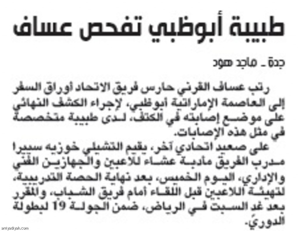 رتب عساف القرني حارس فريق الاتحاد أوراق السفر إلى العاصمة الإماراتية أبوظبي، لإجراء الكشف النهائي على موضع إصابته في الكتف، لدى طبيبة متخصصة في مثل هذه الإصابات.