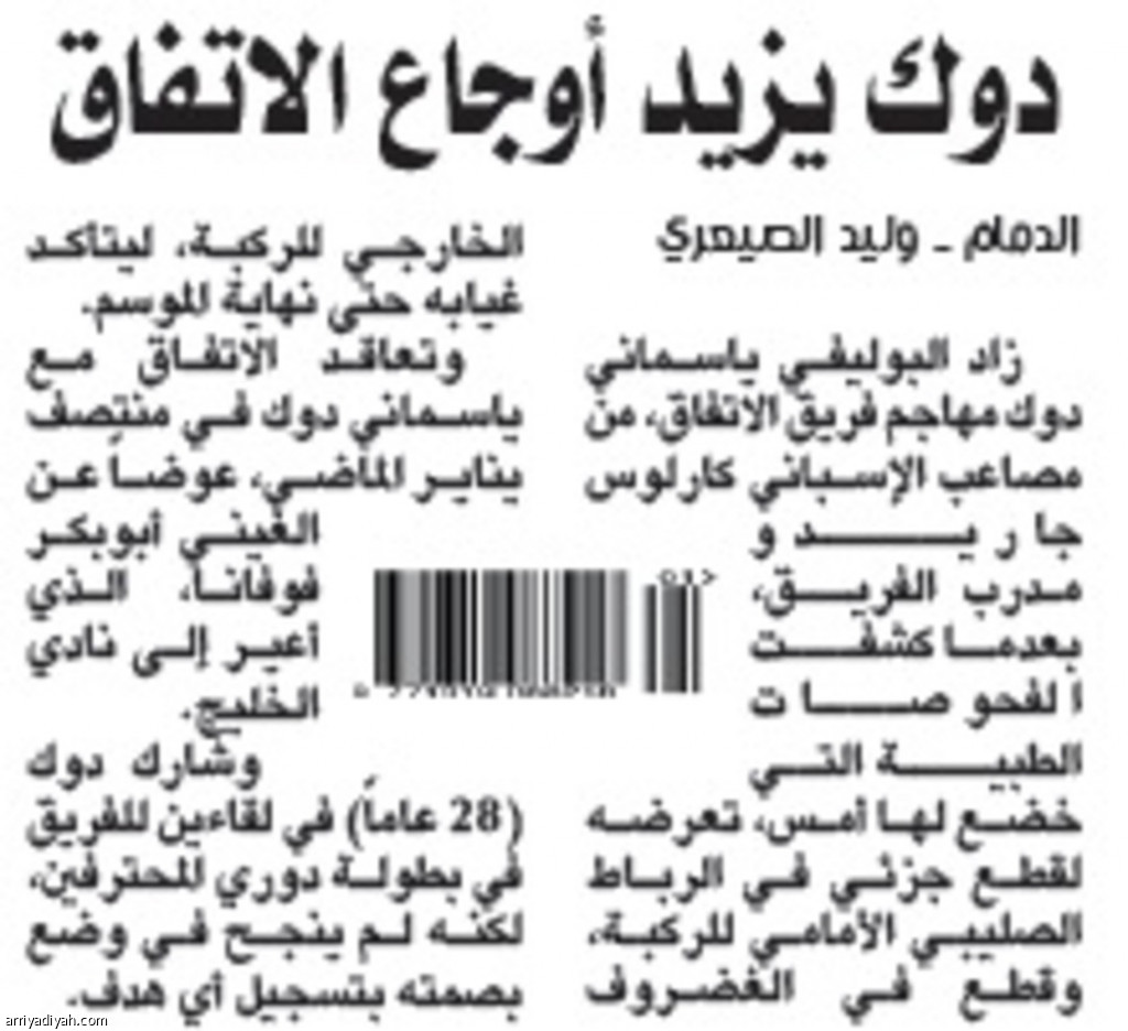 وتعاقد الاتفاق مع ياسماني دوك في منتصف يناير الماضي، عوضاً عن الغيني أبوبكر فوفانا، الذي أعير إلى نادي الخليج.