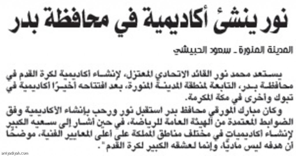 يستعد محمد نور القائد الاتحادي المعتزل، لإنشاء أكاديمية لكرة القدم في محافظة بدر، التابعة لمنطقة المدينة المنورة، بعد افتتاحه أخيرًا أكاديمية في تبوك وأخرى في مكة المكرمة.
