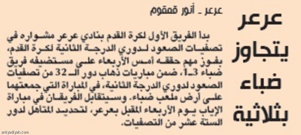 بدأ الفريق الأول لكرة القدم بنادي عرعر مشواره في تصفيات الصعود لدوري الدرجة الثانية لكرة القدم، بفوز مهم حققه أمس الأربعاء على مستضيفه فريق ضباء 3ـ1، ضمن مباريات ذهاب دور الـ 32 من تصفيات الصعود لدوري الدرجة الثانية، في المباراة التي جمعتهما على أرض ملعب ضباء. وسيتقابل الفريقان في مباراة الإياب يوم الأربعاء المقبل بعرعر، لتحديد المتأهل لدور الستة عشر من التصفيات.