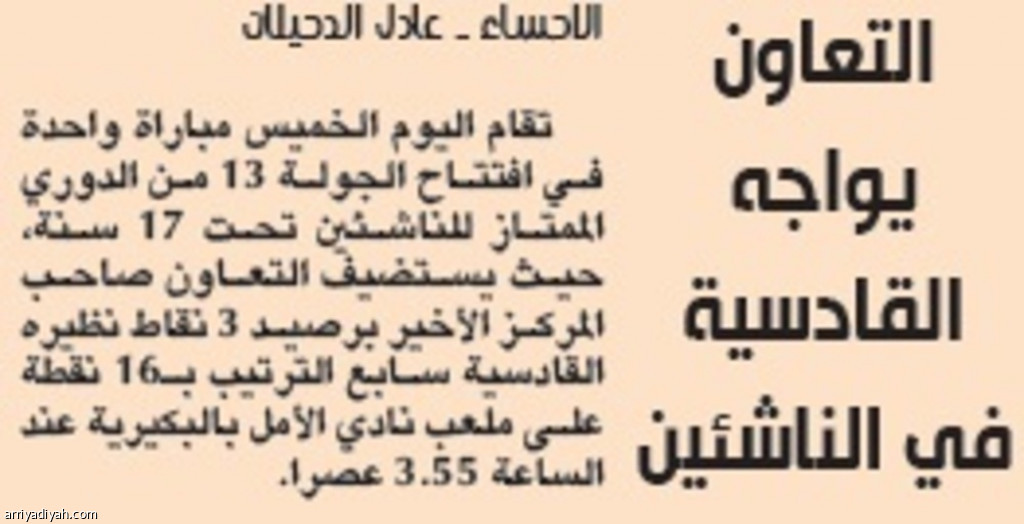 تقام اليوم الخميس مباراة واحدة في افتتاح الجولة 13 من الدوري الممتاز للناشئين تحت 17 سنة، حيث يستضيف التعاون صاحب المركز الأخير برصيد 3 نقاط نظيره القادسية سابع الترتيب بـ16 نقطة على ملعب نادي الأمل بالبكيرية عند الساعة 3.55 عصرا.