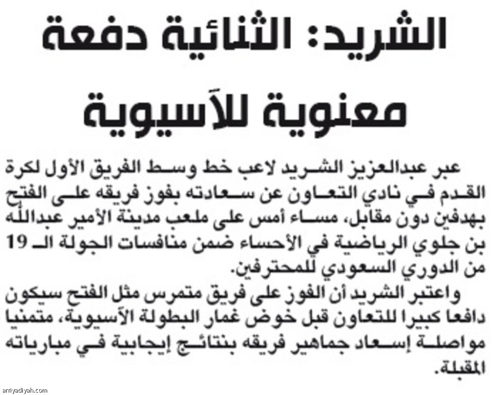 الشريد: الثنائية دفعة معنوية للآسيوية