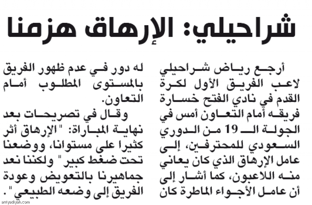 أرجع رياض شراحيلي لاعب الفريق الأول لكرة القدم في نادي الفتح خسارة فريقه أمام التعاون أمس في الجولة الـ 19 من الدوري السعودي للمحترفين، إلى عامل الإرهاق الذي كان يعاني منه اللاعبون، كما أشار إلى أن عامل الأجواء الماطرة كان له دور في عدم ظهور الفريق بالمستوى المطلوب أمام التعاون.