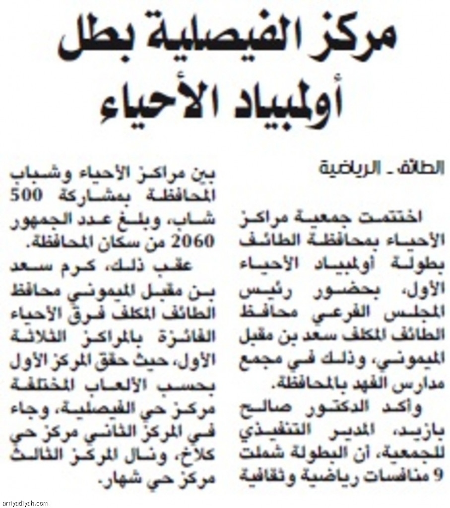 اختتمت جمعية مراكز الأحياء بمحافظة الطائف بطولة أولمبياد الأحياء الأول، بحضور رئيس المجلس الفرعي محافظ الطائف المكلف سعد بن مقبل الميموني، وذلك في مجمع مدارس الفهد بالمحافظة.