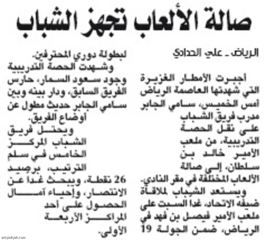 أجبرت الأمطار الغزيرة التي شهدتها العاصمة الرياض أمس الخميس، سامي الجابر مدرب فريق الشباب على نقل الحصة التدريبية، من ملعب الأمير خالد بن سلطان، إلى صالة الألعاب المختلفة في مقر النادي.