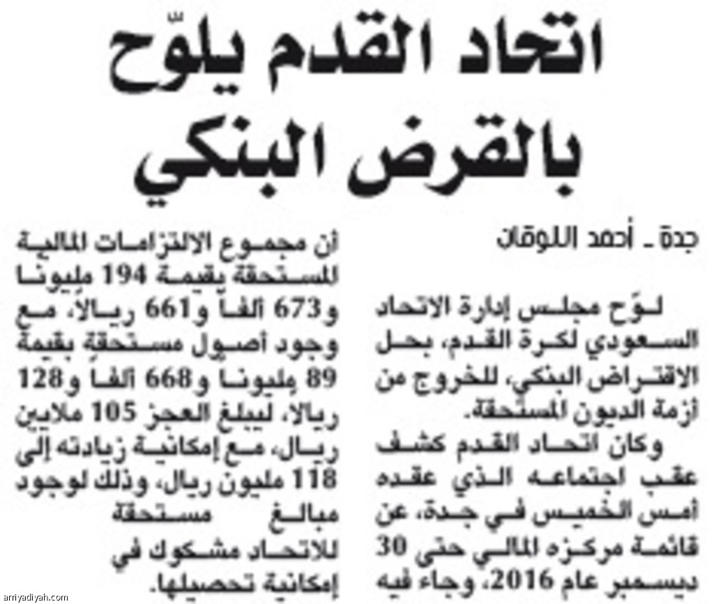 وكان اتحاد القدم كشف عقب اجتماعه الذي عقده أمس الخميس في جدة، عن قائمة مركزه المالي حتى 30 ديسمبر عام 2016، وجاء فيه أن مجموع الالتزامات المالية المستحقة بقيمة 194 مليونًا و673 ألفاً و661 ريالاً، مع وجود أصول مستحقة بقيمة 89 مليوناً و668 ألفاً و128 ريالاً، ليبلغ العجز 105 ملايين ريال، مع إمكانية زيادته إلى 118 مليون ريال، وذلك لوجود مبالغ مستحقة للاتحاد مشكوك في إمكانية تحصيلها.