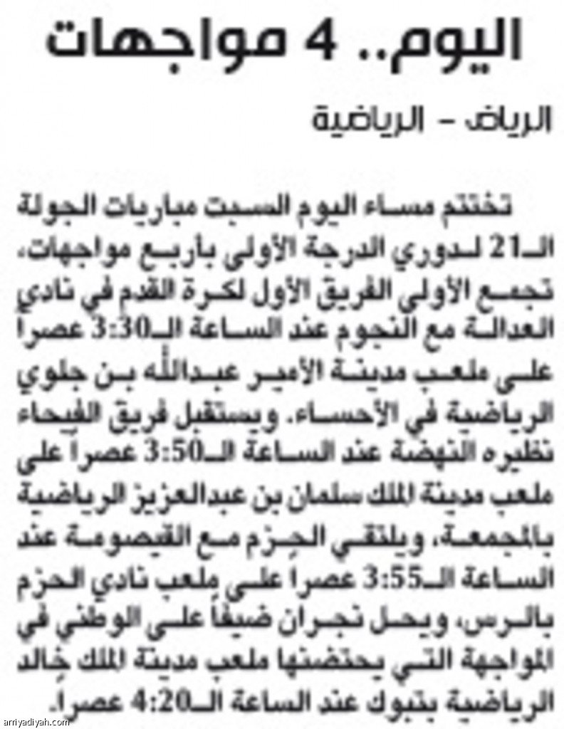 تختتم مساء اليوم السبت مباريات الجولة الـ٢١ لدوري الدرجة الأولى بأربع مواجهات، تجمع الأولى الفريق الأول لكرة القدم في نادي العدالة مع النجوم عند الساعة الـ٣:٣٠ عصراً على ملعب مدينة الأمير عبدالله بن جلوي الرياضية في الأحساء. ويستقبل فريق الفيحاء نظيره النهضة عند الساعة الـ٣:٥٠ عصراً على ملعب مدينة الملك سلمان بن عبدالعزيز الرياضية بالمجمعة، ويلتقي الحزم مع القيصومة عند الساعة الـ٣:٥٥ عصراً على ملعب نادي الحزم بالرس، ويحل نجران ضيفاً على الوطني في المواجهة التي يحتضنها ملعب مدينة الملك خالد الرياضية بتبوك عند الساعة الـ٤:٢٠ عصراً.