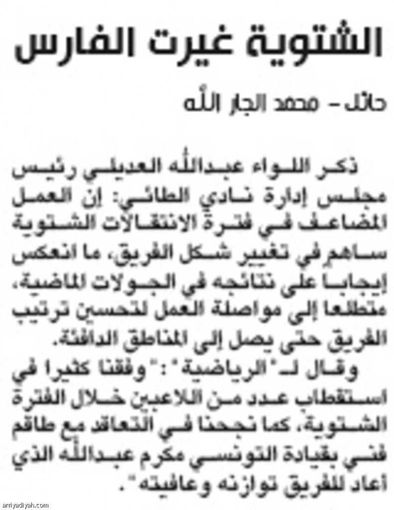 ذكر اللواء عبدالله العديلي رئيس مجلس إدارة نادي الطائي: إن العمل المضاعف في فترة الانتقالات الشتوية ساهم في تغيير شكل الفريق، ما انعكس إيجاباً على نتائجه في الجولات الماضية، متطلعا إلى مواصلة العمل لتحسين ترتيب الفريق حتى يصل إلى المناطق الدافئة.