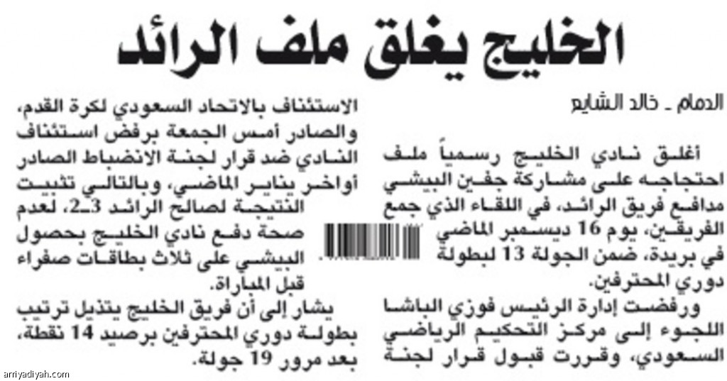 ورفضت إدارة الرئيس فوزي الباشا اللجوء إلى مركز التحكيم الرياضي السعودي، وقررت قبول قرار لجنة الاستئناف بالاتحاد السعودي لكرة القدم، والصادر أمس الجمعة برفض استئناف النادي ضد قرار لجنة الانضباط الصادر أواخر يناير الماضي، وبالتالي تثبيت النتيجة لصالح الرائد 3ـ2، لعدم صحة دفع نادي الخليج بحصول البيشي على ثلاث بطاقات صفراء قبل المباراة.