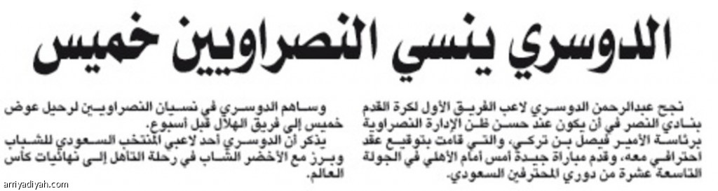 وساهم الدوسري في نسيان النصراويين لرحيل عوض خميس إلى فريق الهلال قبل أسبوع.