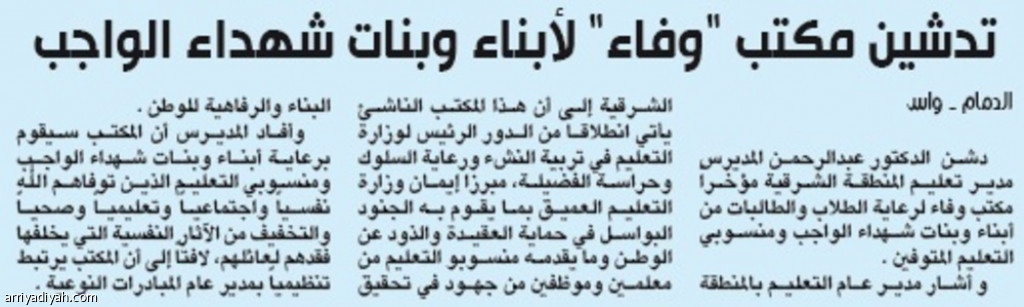 دشن الدكتور عبدالرحمن المديرس مدير تعليم المنطقة الشرقية مؤخراً مكتب وفاء لرعاية الطلاب والطالبات من أبناء وبنات شهداء الواجب ومنسوبي التعليم المتوفين .